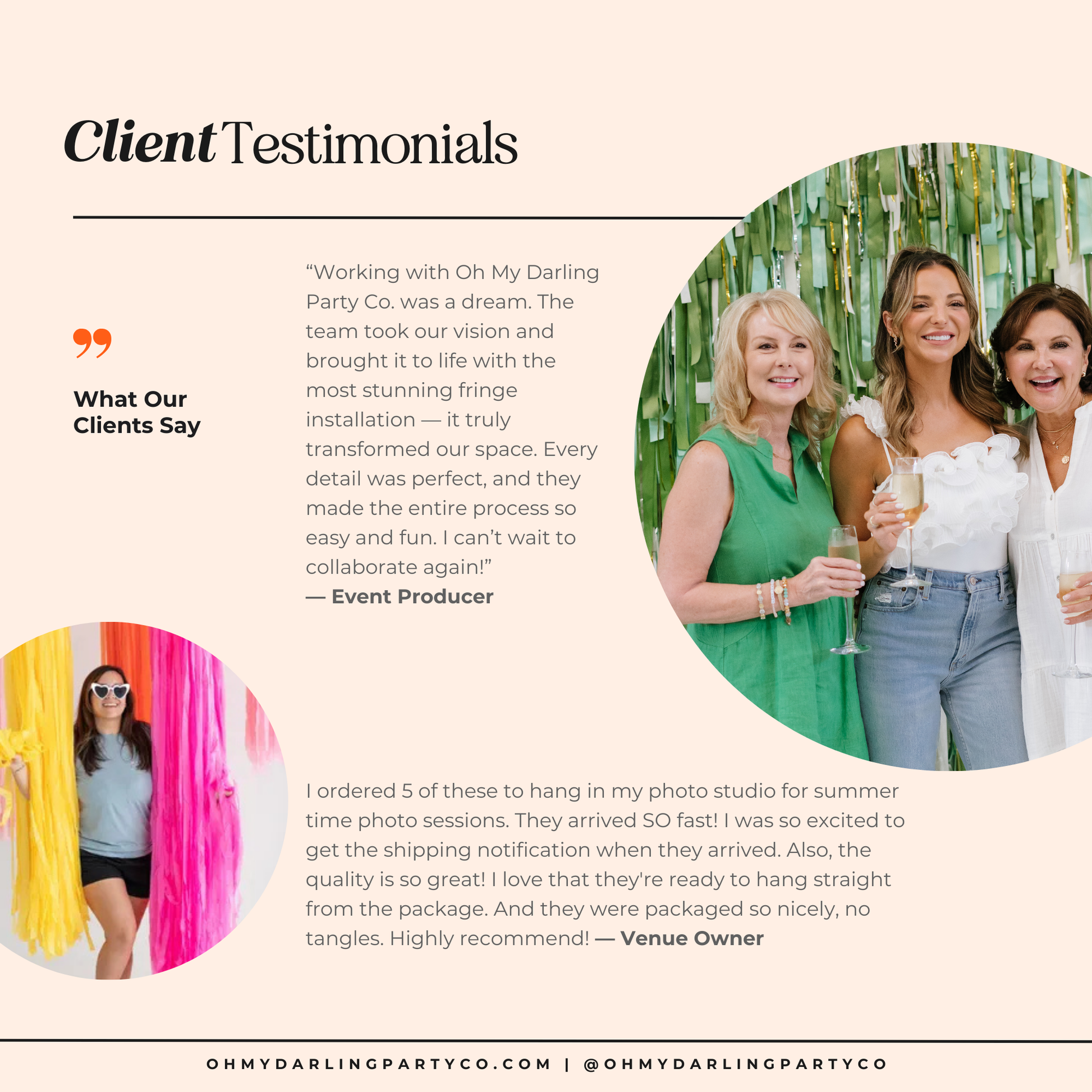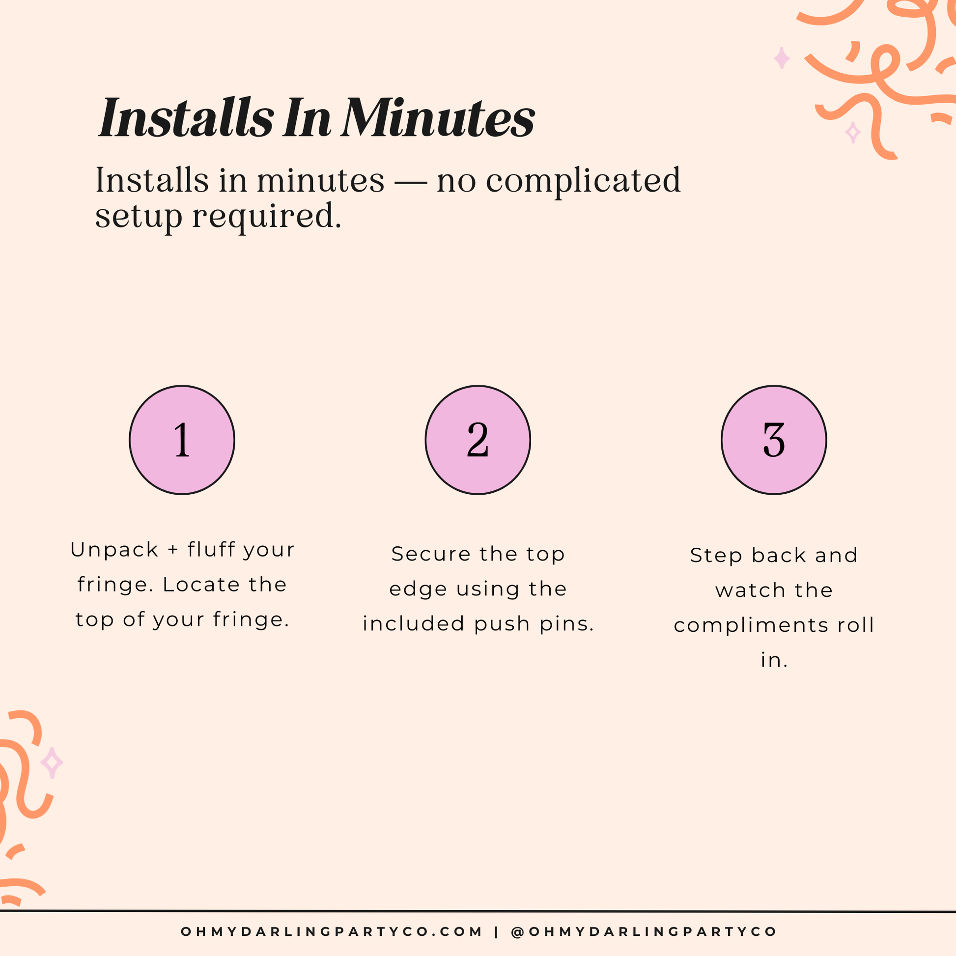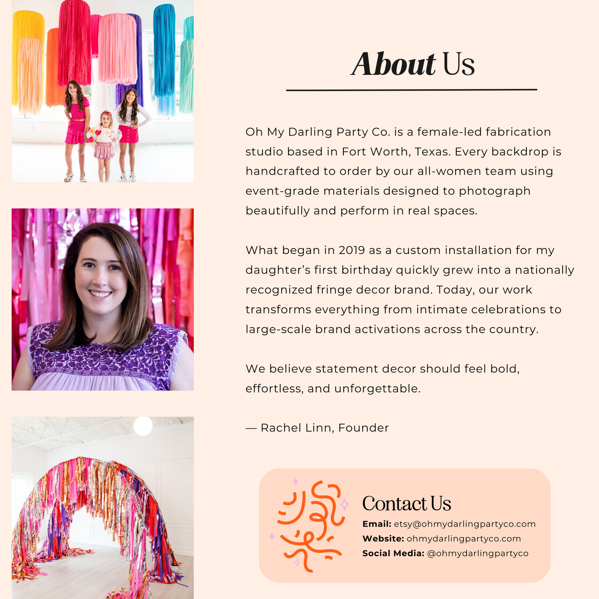 Returns: While we don’t take returns on any of our fringe products, we totally get that sometimes things don’t go as planned. Just shoot us an email at care@ohmydarlingpartyco.com, and our sparkling customer service team will swoop in to save the day. We’ve got your back every step of the way. 💖