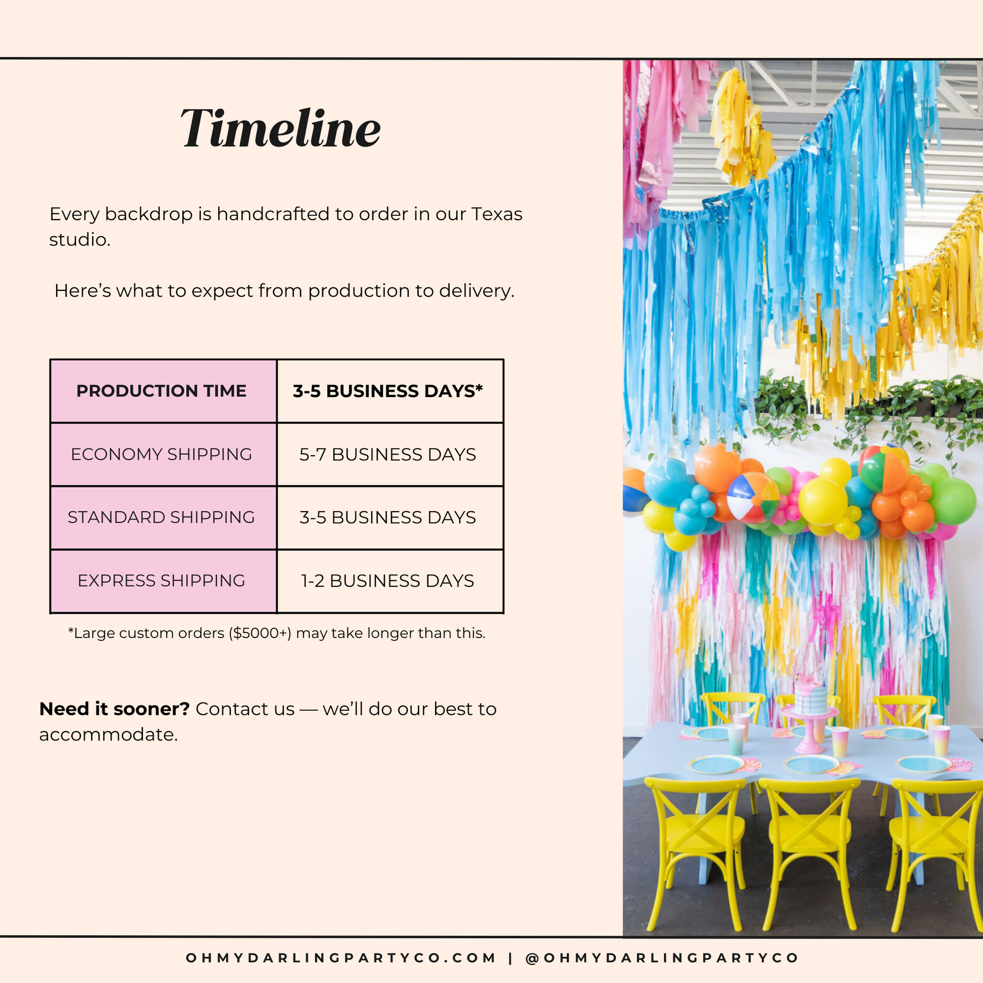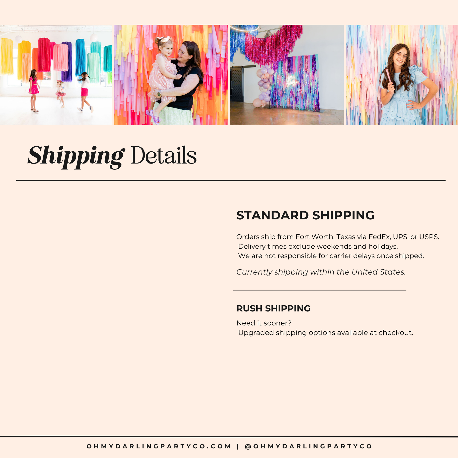 Shipping: Shipping is free for all orders over $399. You can also opt for free pickup Monday-Thursday at our North Fort Worth, Texas location. Each backdrop is handmade to order right here in Texas, USA, with a production timeline of just 5-7 business days. Your order will arrive fully assembled and ready to hang, shipped via UPS, USPS, or FedEx. Need it faster? Upgrades are available at checkout to make sure your celebration is nothing short of spectacular. ✨